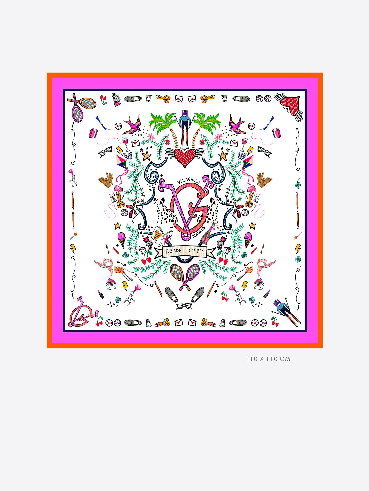Elevate your style with our stunning silk square scarf! Featuring vibrant orange and pink borders, this accessory is a playful addition to any outfit. Adorned with whimsical designs, it’s perfect for adding a splash of color to your look.